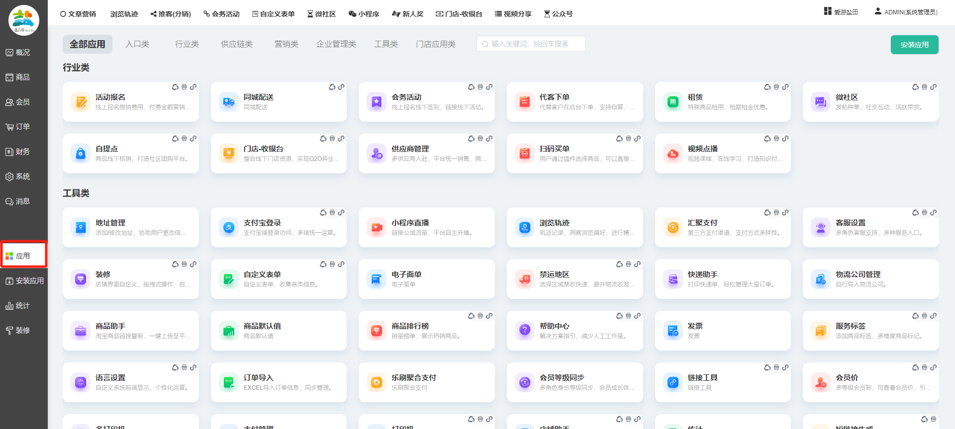 目录 搜索 展开 一、前期准备资料二、数字乡村码-上线操作指南1、服务号的申请流程及认证2、申请小程序流程3、开放平台绑定小程序和公众号三、数字乡村码-系统操作数字乡村码系统管理-概况数字乡村码-商品管理1、发布商品2、商品列表3、商品表单4、商品分类5、品牌管理6、配送模板7、评论管理8、优惠券管理9、商品标签10、退货地址设置11、满额优惠12、批量操作13、配送方式14、基础设置15、商品隐藏四、数字乡村码-会员管理1、全部会员2、会员等级3、会员分组4、资格申请5、会员设置6、推广中心设置7、会员邀请码8、会员关系链修改关系链修改记录9、会员合并记录10、账号注销管理11、会员设置中心五、数字乡村码-订单管理1、订单管理列表2、订单处理流程3、订单状态4、订单修改价格5、订单退款退货6、多包裹发货7、批量发货订单操作步骤8、催发货订单9、物流查询六、数字乡村码-财务管理1、余额设置2、会员余额3、充值记录4、转让记录5、余额明细6、收入明细7、提现设置8、提现统计9、积分管理10、转账审核11、收益广告12、批量充值七、数字乡村码-系统管理1、商城入口2、商城设置①、商城设置②、订单设置③、物流查询④、短信⑤、联系方式⑥、分类⑦、优惠券⑧、分享⑨、幻灯片⑩、广告位⑫、地图设置3、交易设置4、微信模板消息自定义消息模板(新版)自定义消息模板(旧版)小程序消息模板公众号模板消息变更公告5、语言设置6、权限管理7、多媒体管理八、数字乡村码-消息管理九、数字乡村码-应用管理十、数字乡村码系统-数据统计十一、数字乡村码-页面装修DIY1、模板管理2、店铺页面3、顶部导航4、底部导航5、DIY模板市场6、首屏广告7、基础设置8、装修DIY尺寸建议十二、供应商功能插件操作指南1、供应商2、门店-收银台门店申请和使用步骤门店管理①、门店-收银台 营销设置②、门店-收银台 分润设置门店分类门店申请门店审核门店商品门店商品订单收银台订单数据统计核销员基础设置默认设置门店装修3、微社区4、会务活动十三、营销插件操作指南活动报名提货卡新人奖微店问卷调查积分视频分享1、视频分享基础设置2、视频分享发现管理3、视频分享分类管理4、视频分享评论管理5、视频分享分红记录6、视频分享短视频中心每日红包幸运大抽奖签到优惠券二维码任务奖励优惠劵文章音频文章付费文章限时购新海报拓客卡操作流程积分活动素材中心视频红包十四、入驻门店应用类1、门店预约2、附近商品3、门店定位设置4、门店控制5、门店满额包邮6、门店满额减7、导入商品8、门店搜索9、门店股东10、核销券11、多门店核销1、商城后台设置2、前端功能演示十五、常见问题1、后台登录密码修改流程2、会员-余额,积分,后台如何进行充值与扣除3、如何修改上下级关系4、一种万能的获取商城小程序路径的方法 暂无相关搜索结果! 阅读次数:2121 本文档使用 模王系统 发布 九、数字乡村码-应用管理 九、商城管理-应用显示所有商城已安装并启用的应用,包含以下大类:具体根据自家商城后台系统显示为准。每个应用功能设置步骤较多,请查看相对应应用的学习文档。文档更新时间: 2024-01-08 10:36 作者:链上旅行