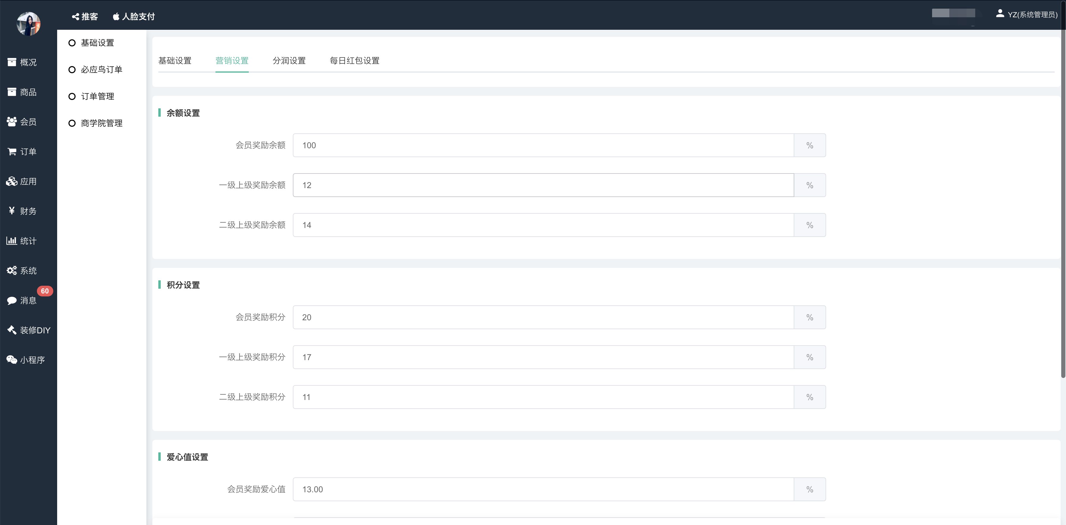 支持设置余额、积分、消费积分,包括:会员奖励、会员一级上级奖励、会员二级上级奖励。