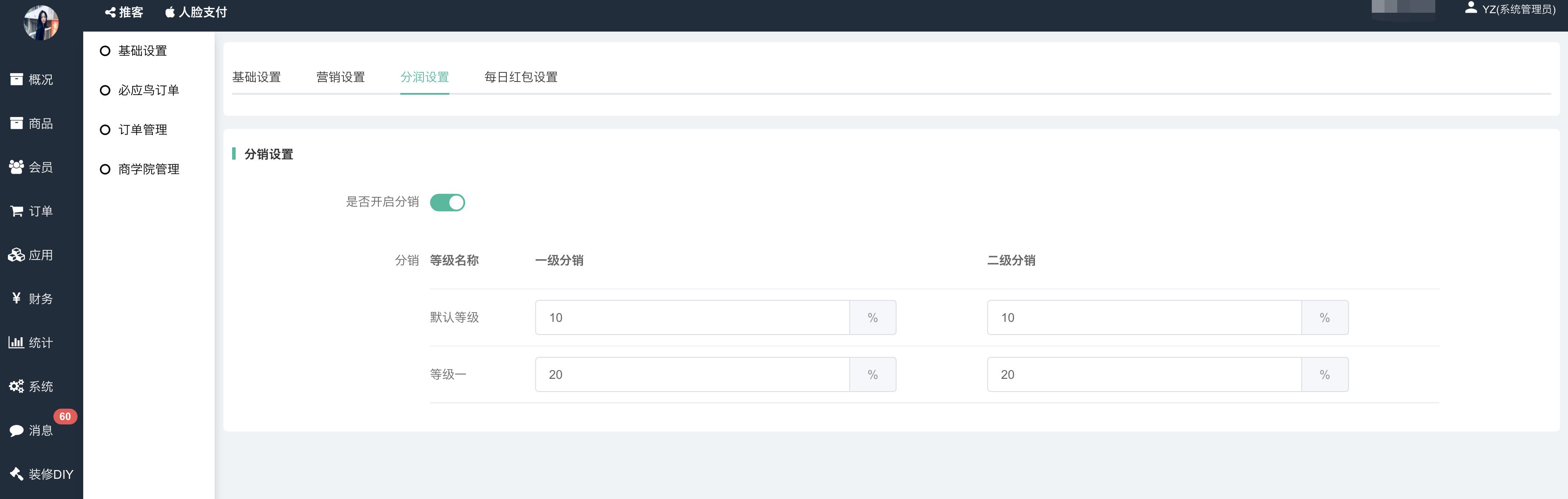 营销设置中设置会员奖励余额30%、一级上级奖励余额20%、二级上级奖励余额10%;则