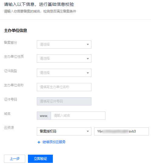 详情请查看 备案材料。主办单位名称请输入主办单位名称,需与单位证件上的名称及账号实名认证名称一致。证件号码请输入证件号码,需与账号实名认证的单位证件号码保持一致。域名请输入需要进行备案的二级域名。