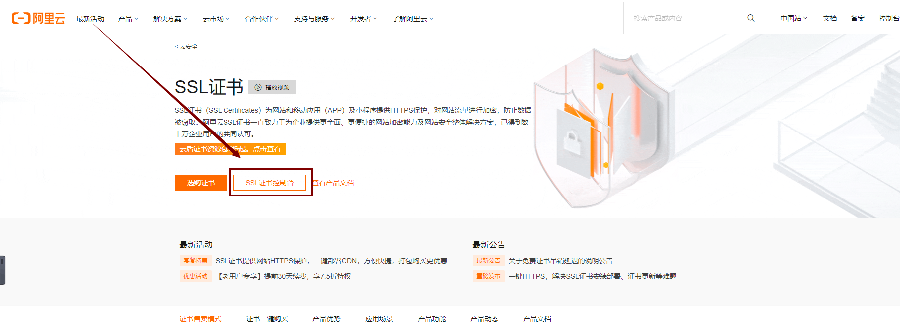1、登录:阿里云-产品-SSL证书。