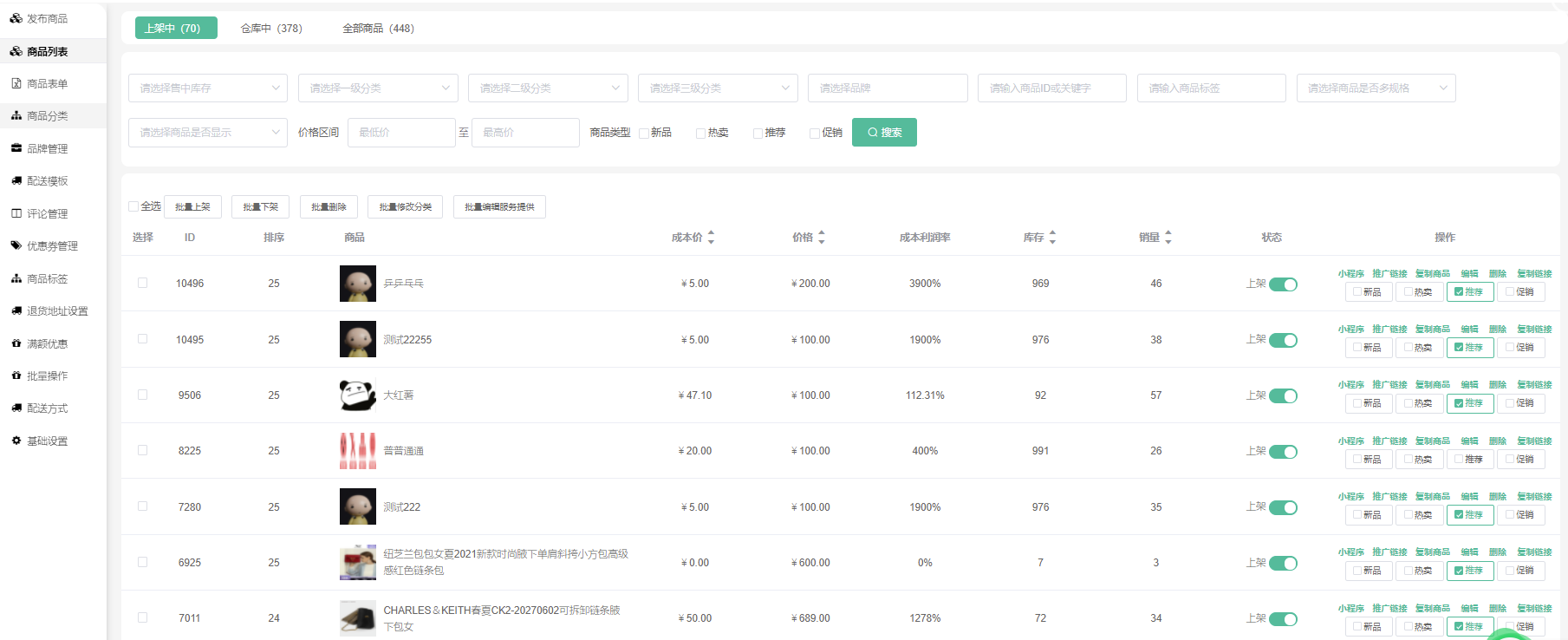 操作:支持小程序二维码(需要先点击生成),推广二维码,快速设置商品新品、热卖、推荐、促销属性,复制链接(复制商品前端访问的链接)、删除、编辑、复制商品(复制一款一模一样的商品信息的商品,便于快速上架同类型商品)。