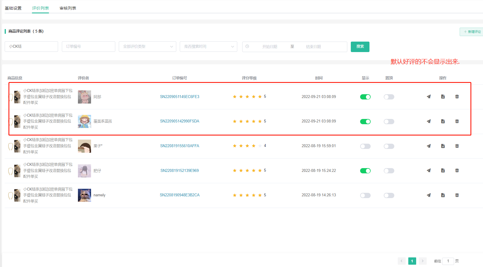 3、是否显示、置顶评价