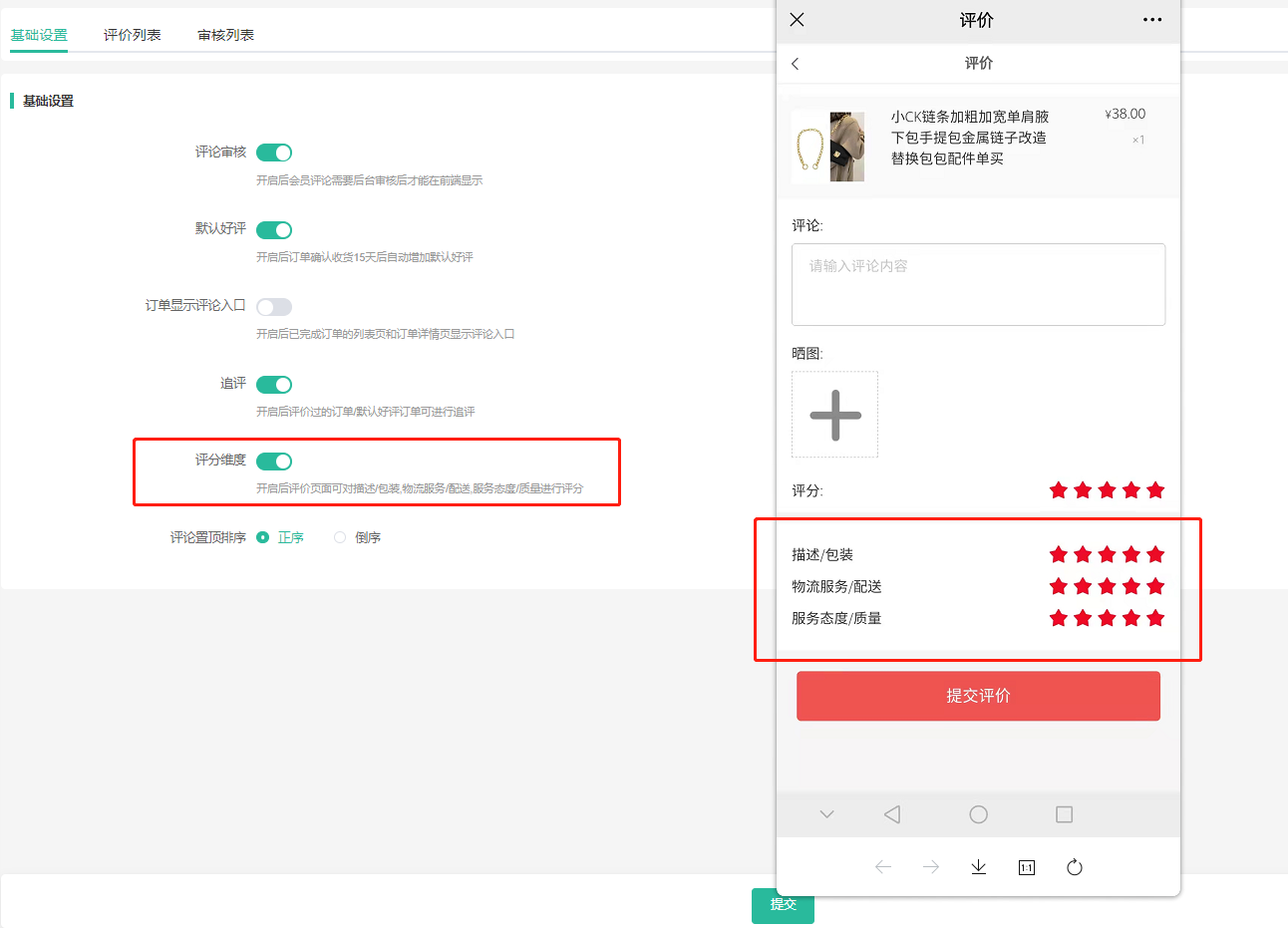开启后评价页面可对描述包装,物流服务/配送,服务态度/质量进行评分。