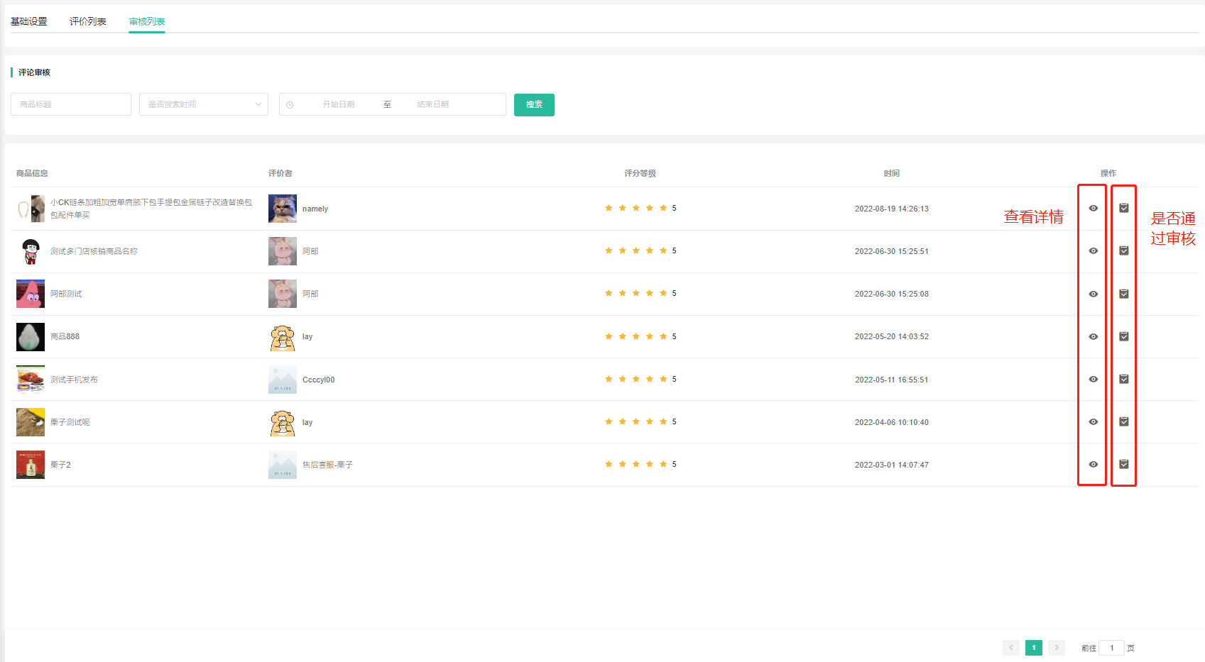 支持查看会员商品评价、是否通过审核、是否显示、是否置顶。