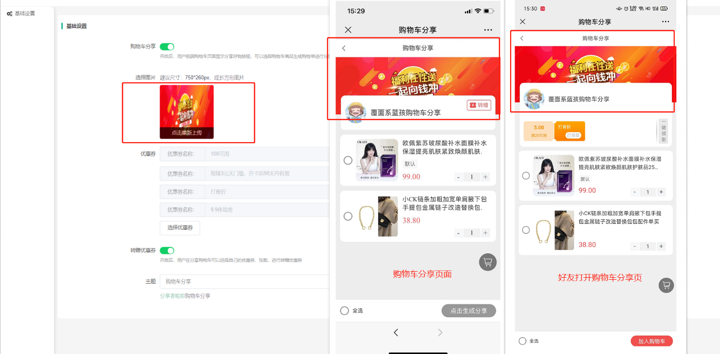 转赠优惠券:开启后,用户在分享购物车可以选择自己的优惠券(会员自己领取的所有平台优惠券)、张数、进行转赠优惠券